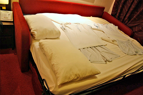 Y por último otra de las cosas más curiosas del crucero es la atención del pasaje. Sin que te des cuenta estás siendo vigilad@! En cuanto te vayas de tu camarote tendrás a tus encargados de habitación ordenándola entera. No pasa nada porque te dejes una cartera o una tablet encima del escritorio. Hay quien piensa ¿Me la robarán? aquí seguramente te ordenen hasta el cargador. A mi madre le emparejaron hasta los pendientes que se dejó por ahí tirados! Pero lo más curioso de todo fue esto: si eres ordenad@ y te da vergüenza que piensen lo contrario, ordena tu camarote antes de que lo hagan ellos! Así nos encontramos nuestro sofá cama y nuestros pijamas despues de la cena de gala ¡¡Sorpresa!! (No es que nos abrieran la maleta en busca de los pijamas. Cuando nos fuimos a desayunar por la mañana los dejamos tirados a saber donde, pero cuando volvimos, el camarote ya estaba limpio, ordenado y los pijamas desaparecieron. Por la noche el camarote apareció así) Y ésto fue todo. Al día siguiente tocaba la excursión a Roma!