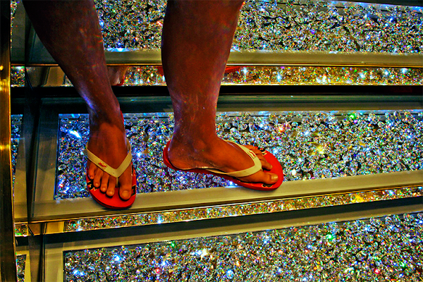 ¿Y no os he hablado del salón principal del barco? ¡Si es lo más espectacular que tiene! Era la cena de gala ¿casualidad? que va. Es el día de navegación. Todos los pasajeros tienen el día libre para ir de compras a bordo, peluquería, etc, etc. La cena de gala consiste en una cena en la que todo el mundo va de gala, así de simple. Creo que no tiene más misterio. Pero mola que te cagas hacerse una foto de gala en las escaleras del gran salón: imagina varias escaleras en las que cada escalón está hecho con cientos de cristalitos de swarovski. Difícil encontrar algo más lujoso! la verdad que el barco es muy moderno y elegante a la vez. Al menos más elegante que mi hermano y yo en chancletas!