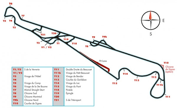 Algunos puntos sobresalientes en el circuito situado cerca de Marsella en el sur de Francia, incluyen: el Verrerie Esses y la curva del Camp se ampliará y una chicane dividirá el Mistral en dos secciones.