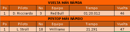 La vuelta más rápida fue lograda por Daniel Ricciardo, el australiano lleva 13 en todo su historia, mientras que Red Bull aumenta su cuenta hasta la 59.