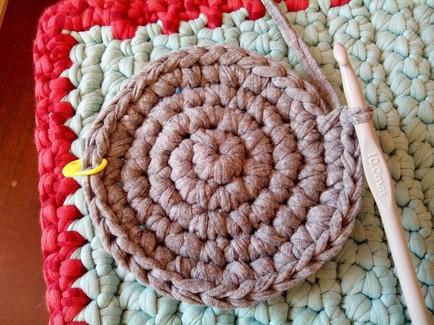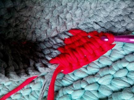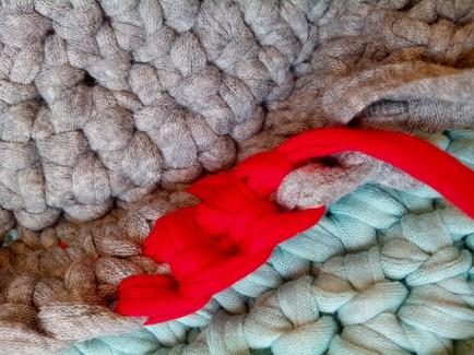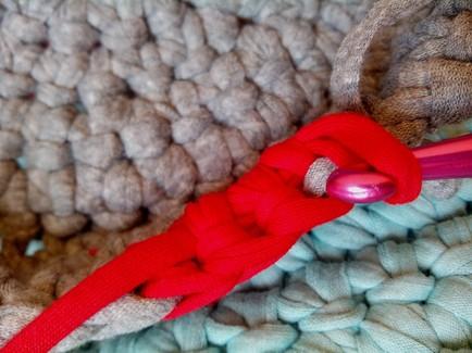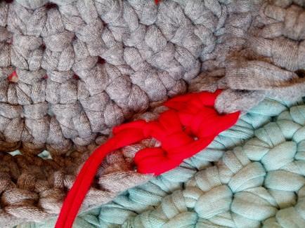 En esta imagen se aprecia mejor el paso de ir ocultando el rabillo restante del trapillo rojo con el que estamos trabajando y cerramos con el de color gris en este caso, ya que solo quiero hacer un punto.