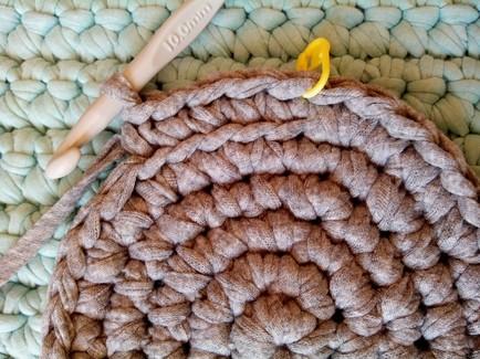 SUBIDA: Como ya he alcanzado el diámetro de 15 cm. que buscaba en la cesta, empiezo subiendo la labor con una vuelta cogiendo una sola hebra.