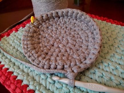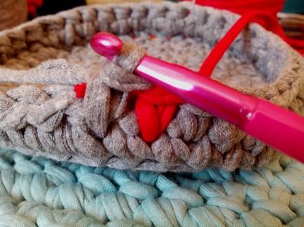 Este es el aspecto que nos debe quedar en la cesta tejiendo los dos colores a la vez. La hebra del color rojo lo dejo suelto para añadirlo a la próxima vuelta, hacemos la vuelta entera de puntos bajos en gris.