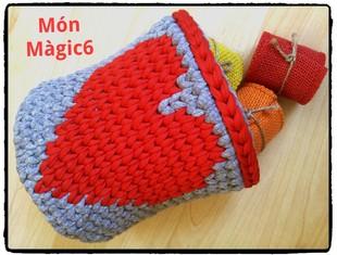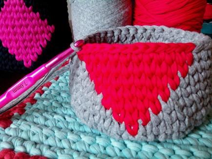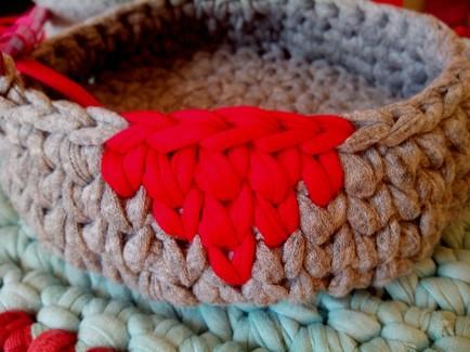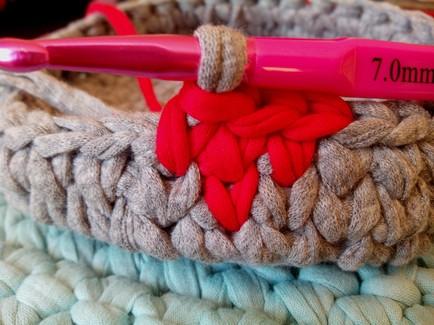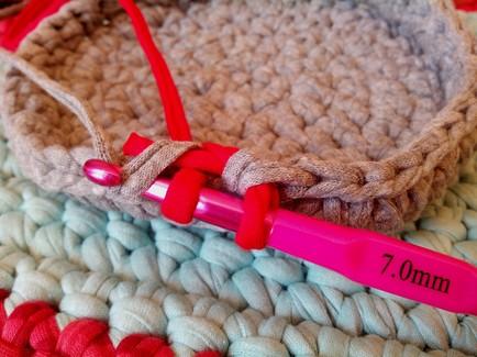 Esta es una imagen de la parte interna de la cesta donde se ve perfectamente como queda la hebra de color gris escondida dentro de todos los puntos bajos en color rojo. (Acordaros de ir pasando el hilo de color rojo al otro extremo para facilitaros el tejido)