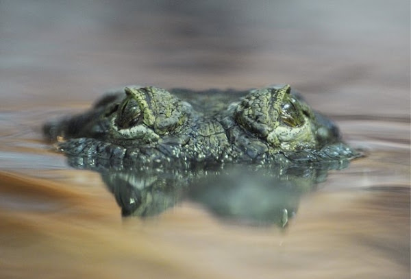 El depredador cocodrilo nada sigilosamente por las densas aguas. Deslizándose dirección hacia su presa.