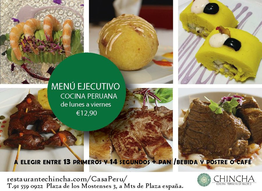 Frente a otro mercado madrileño, el Mercado de los Mostenses, (del cual se abastece para ofrecernos los productos de temporada) a pocos metros de la Plaza España , nos encontramos con Chincha, restaurante peruano en Madrid, que además de ser uno de los restaurantes peruanos en Madrid más recomendados por los críticos gastronómicos por su calidad y variedad de platos, nos ofrece una cocina peruana de origen con una carta muy completa y un menú diario, de esos que ya no se encuentran, donde podemos elegir entre 13 primeros y 14 segundos, todos realizados en el momento que incluye pan, bebida y café o postre por solo 12,90€