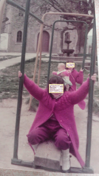 Por primavera o verano, durante muchos años les hacíamos un bautizo. Aprovechábamos la comida familiar con mis abuelos, mi tío, mis tíos abuelos para llevarlos con los trajes de bautizo de otros muñecos y después de comer dábamos unos recordatorios hechos por mí, y alguna manualidad chula. A veces hacíamos fotos que aún conservo(y os pongo una) y a los hombres les dábamos puros y a las señoras unos bombones que hacía yo con unas hueveras de plástico y chocolate.