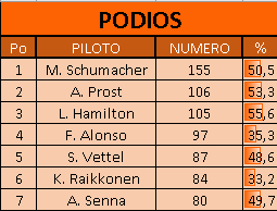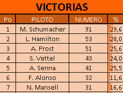 De los pilotos activos, Hamilton tiene mayor porcentaje de victorias, con un total de 28%, Vettel tiene un 24% y Schumacher, el piloto que mas triunfó en la F1 contando 91 primeros lugares, cuenta con un 29,6%.