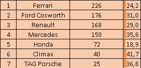 Por otra parte, el motor Ferrari logra su victoria número 226, aventajando por 50 triunfos al 2° lugar en esta estadística, el motor Ford Cosworth.