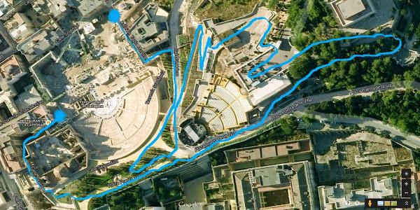 El paseo comienza en la escalera de la calle Dr. Tapia Martínez. Casi desde su comienzo ya puede verse el Teatro Romano, una de las joyas de la ciudad, que poco a poco empieza a perder altura según la voy ganando yo.