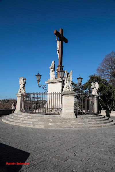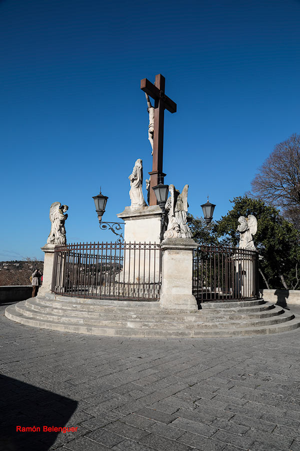 Una pequeña plaza delantera tiene un bonito conjunto escultórico con Jesucristo crucificado