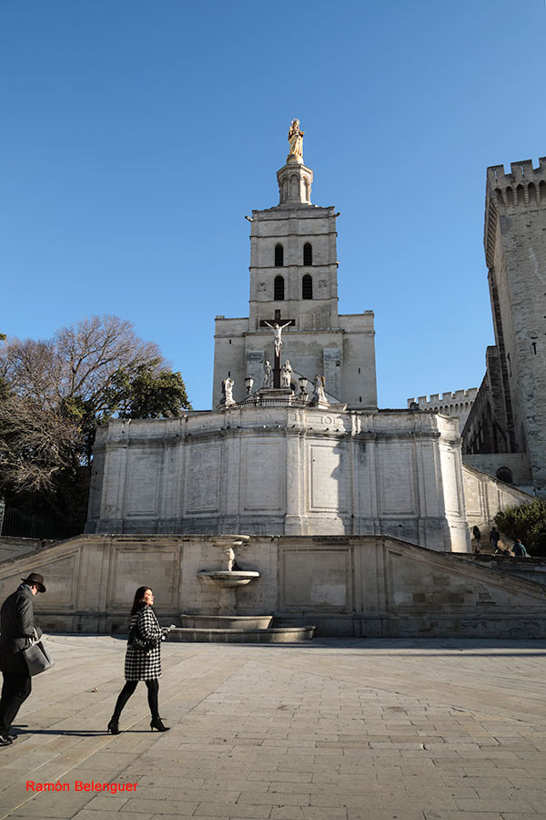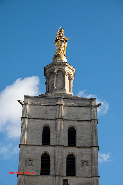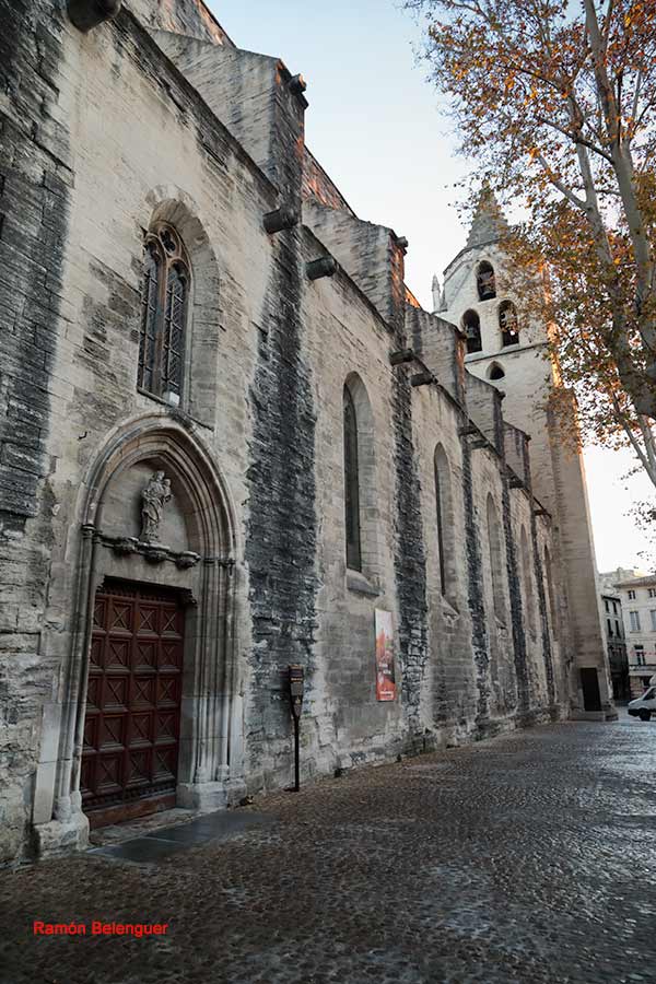 La catedral románica de Notre-Dame-des-Doms (Cathédrale Notre-Dame des Doms dAvignon) es un edificio religioso católico y monumento nacional de Francia, se encuentra al norte del Palacio de los Papas. En ella se venera a Nuestra Señora de Todo Poder. Se encuentran enterrados algunos papas.Construida sobre los cimientos de una basílica católica del siglo IV, la catedral de Aviñón se erigió en el siglo XII, siendo restaurada por completo en los siglos XV y XVII. Su campanario está coronado por una gran estatua dorada de Santa María. En el exterior, el frontón triangular, se aprecian las huellas de la semejanza con los frescos de Simona Martín pintados en el consistorio del Palacio de los Papas. El campanario fue dañado durante su asentamiento del palacio en 1405 y se reconstruyo sin aguja. El interior, el templo tiene una planta con una sola nave, se entra atravesando el nartex que contiene una ornamentación clasicista. En los laterales se encuentran encajonadas las capillas laterales y la tribuna del siglo XVII y una cúpula románica sobre el crucero, a la izquierda tiene la capilla de san Juan, construida en el siglo XV, destaca por el Ecce Homo de piedra del siglo XVI. En las naves se conservan lienzos de N Mignard y R. Levieux, una cátedra episcopal de mármol del siglo XII con los símbolos de los evangelistas San Marcos y San Lucas. Al fondo de la nave derecha está la capilla de los Apóstoles, junto a la sacristía, destaca por la tumba gótica de Juan XXII, además de las pinturas de P. Mignard y P. Parrocel. En la parte trasera de la catedral se encuentra el trono del siglo XII que utilizaban los papas de Aviñón. El asiento de mármol blanco está decorado con grabados de animales que representan santos. Cuenta con tres estatuas en honor a la virgen María, la capilla de la Resurrección, con su hermosa cúpula, el espléndido órgano del siglo XVII y el coro, con las sillas talladas en madera adornadas con los retratos de los distintos papas que marcaron durante siglos los destinos de la ciudad. La nave cuenta además con una elegante galería y tribuna de balaustrada barroca que crea una especie de segundo piso dando a la catedral un aire aún más esbelto e imponente.