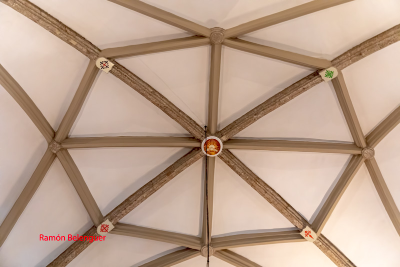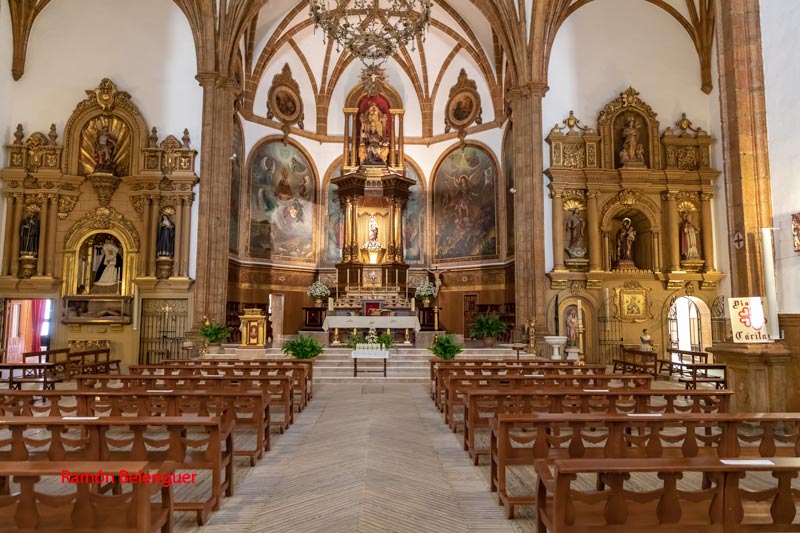 El interior está estructurado en tres naves, separadas por pilares con columnas adosadas, cabecera poligonal y dos ábsides, cubriéndose las naves con bóvedas de terceletes. La decoración en los capiteles es muy interesante, encontramos tanto elementos de carácter vegetal, como representaciones de tipo figurativo como el capitel de la sirena. La notable sillería del coro, en maderas nobles talladas, fue destruida en 1936, así como el retablo mayor.