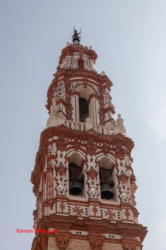 La antigua torre se situaba a los pies de la nave de la Epístola, fue derribada para ser construida de nueva planta. Iniciada por los alarifes ecijanos Lucas Bazán y Antonio Corrales, padeció mucho con el terremoto de 1755, por lo que fue necesario derribar la obra e iniciar otra bajo la supervisión de Pedro de Silva y la dirección de Fernando Martín Bizarro. Se encuentra situada junto a la cabecera de la inacabada iglesia. Consta de un elevado fuste realizado en ladrillo, en el que se abre un balcón en uno de sus frentes con profusa decoración de ladrillo tallado, alternándose en sus frentes vanos circulares. El primer cuerpo, denominado de campanas, consta de dos vanos trilobulados en cada uno de sus frentes, flanqueados por estípites y pinjantes, elevados sobre pedestales. El segundo cuerpo se enmarca por una potente balaustrada pétrea con remates decorativos, de cuyo centro emerge un cuerpo circular de cuatro vanos de medio punto, flanqueados por contrafuertes moldurados. El tercer cuerpo, también circular, de cuatro vanos ciegos, se remata por el cupulín que sirve de base a un ángel portador del estandarte de la Orden de Malta, que hace las veces de veleta. La decoración del conjunto combina molduras, pinjantes, frisos, escudos y capiteles de ladrillo tallado, elementos decorativos pétreos, revocos pintados y cerámica azul vidriada. Esta última se centra en pedestales, etípites, fajas, cupulín, etc. lo que crea un efecto polícromo muy bello junto con el enfoscado de los cuerpos superiores, que lo diferencian claramente del fuste de ladrillo limpio.
