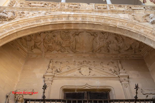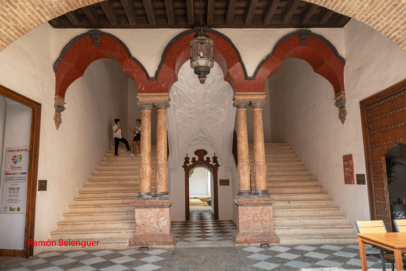 Por último, bajo la escalera se halla la puerta de acceso al patio del palacio, de dos plantas con con arcos de medio punto que apoyan sobre columnas, y una artística fuente de piedra en el centro.