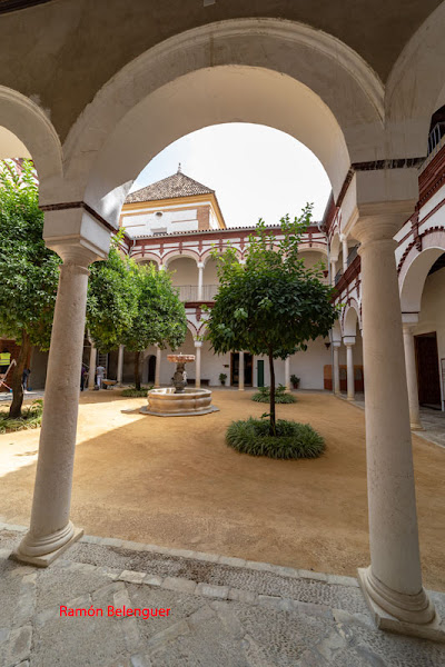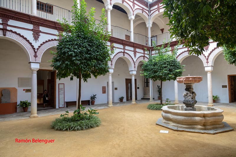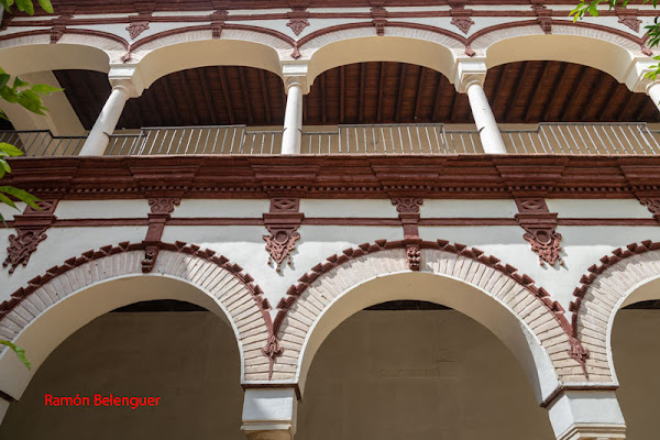 El interior se estructura en torno a un patio cuadrangular de doble arquería neonazarita sobre columnas de estética granadina y arcos polilobulados profusamente decorados en yesería. Las arcadas del piso superior se conforman mediante aljimeces de finas columnillas.