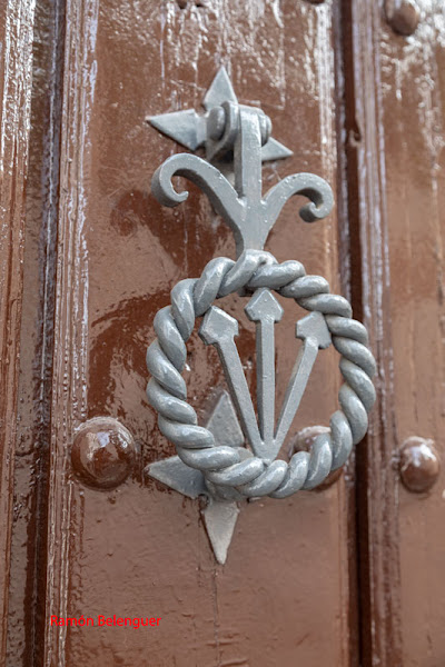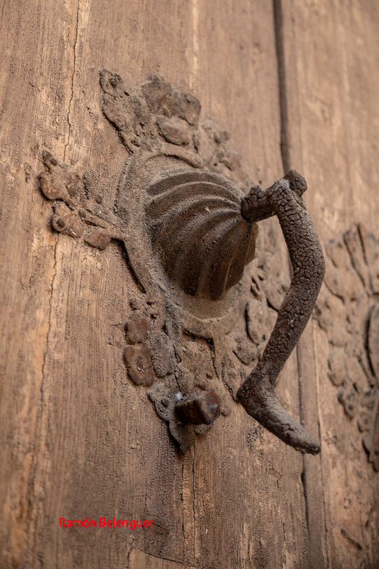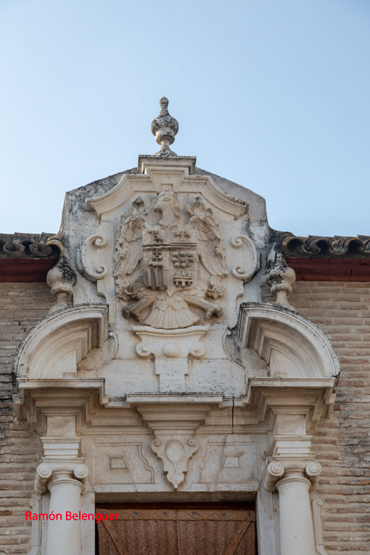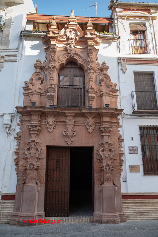 La puerta de acceso al inmueble, muy austera en cuanto a decoración, consta de una amplia portada con arco rebajado adovelado. El portón, de muy buena factura, es de madera con labores de lacería, aunque se aprecia que es material de acarreo.