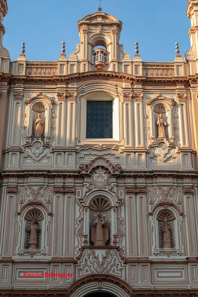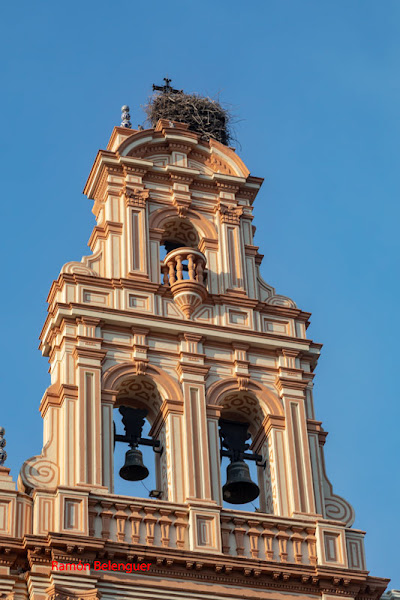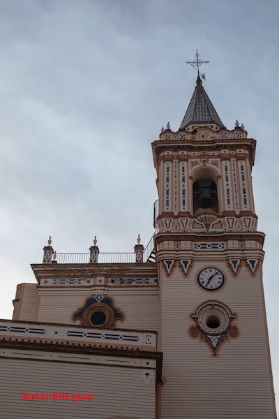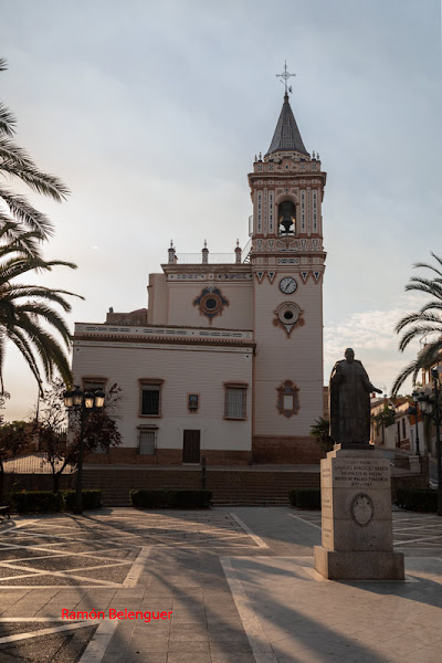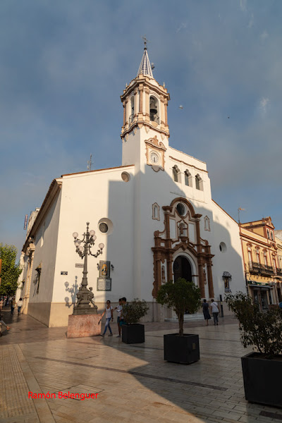 La torre, situada a la derecha de la portada principal, está decorada con festones barrocos. Corona el campanario un chapitel de azulejería sevillana de colores azul y blanco, que se difundirá en campanarios posteriores.