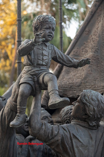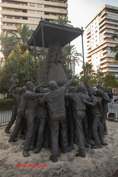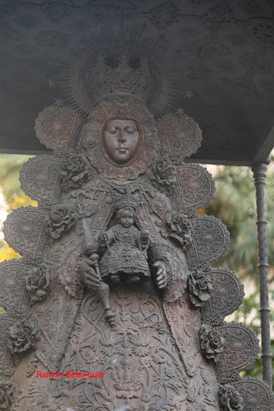 Se encuentra frente a la Plaza del Punto desde el año 2011, siendo su autor el escultor e imaginero rocianero Elías Rodríguez Picón. Tiene unos 4,30 m de alto, 4,50 de fondo y 3 de ancho, y pesa unos 6000 kg. Realizado en bronce patinado, el grupo escultórico representa una escena de la procesión del Lirio de las Marismas, el Lunes de Pentecostés, con la Señora llevada a hombros desde sus andas de Reina Celestial por sesenta figuras de las que brotan interiores fulgores religiosos que les dan un extraño encanto. El artista utilizó personajes reales para encarnar al numeroso grupo: de hecho, El propio Elías aparece junto a su padre, alzando a su hijo de 22 meses hacia la Virgen. La obra también incluye símbolos tales como las medallas de las hermandades de Nuestra Señora del Rocío de Huelva y de Emigrantes.