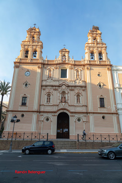 La fachada, de ladrillo revocado, es de estilo barroco y se organiza en tres cuerpos separados por cornisas, en la que resalta el avitolado, quedando enmarcada entre dos torres laterales inconclusas. El inferior juega el papel de zócalo y contiene la puerta de entrada al templo con arco de medio punto enmarcado por dos pares de pilastras a cada lado y con óculos cuatrilobulados. Sus laterales llevan un óculo de forma semicircular.