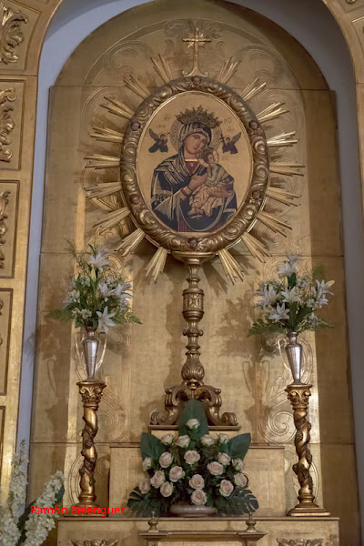 En las calles laterales, en hornacinas se encuentran la Inmaculada Concepción y San José. El retablo mayor de San Pedro se corona con un gran ático semicircular separado del cuerpo inferior por un guardapolvo de gusto clásico mientras que la parte superior de ese ático se remata por guirnaldas. Todo el ático está presidido por un alto relieve del padre eterno en actitud de bendecir y sosteniendo la esfera de universo en su mano izquierda. Va acompañado en los laterales por las esculturas de San Martín de Porres y San Lucas.