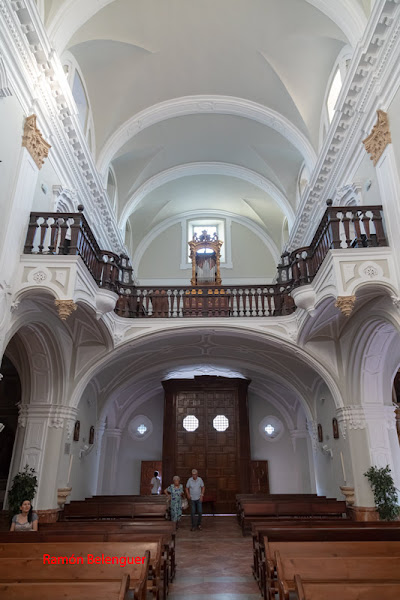 La nave central, más ancha que las contiguas, está cubierta por bóveda de cañón con lunetos. Los arcos fajones descargan en el entablamento y éste sobre pilastras de capiteles corintios adosadas a los machones que reciben a los arcos formeros de medio punto, divisorias de naves. Sobre ellos montan los vibrantes balconcillos de las tribunas colindantes. A los pies de la nave, por encima de la puerta principal de acceso, se extiende la aérea y dinámica tribuna del coro alto, cuyas alas laterales avanzan apoyándose falsamente sobre capiteles corintios.