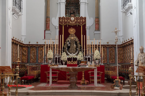 La capilla mayor, transformada en la última restauración, adapta en el antiguo presbiterio el coro de canónigos presidido por la sede episcopal. Tras el coro se dispone una tribuna, destinada a capilla sacramental, con el nuevo camarín de la imagen titular. A esta tribuna se accede mediante una escalinata que parte de la capilla lateral derecha. La sacristía y antesacristía quedan al lado izquierdo.