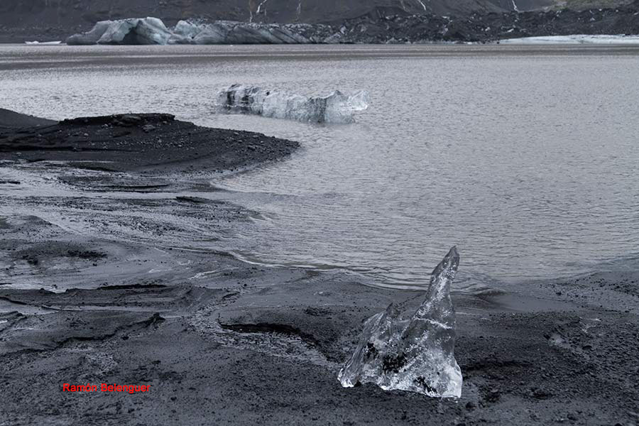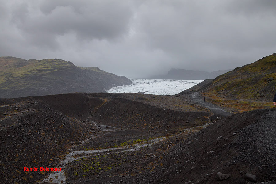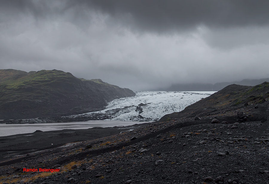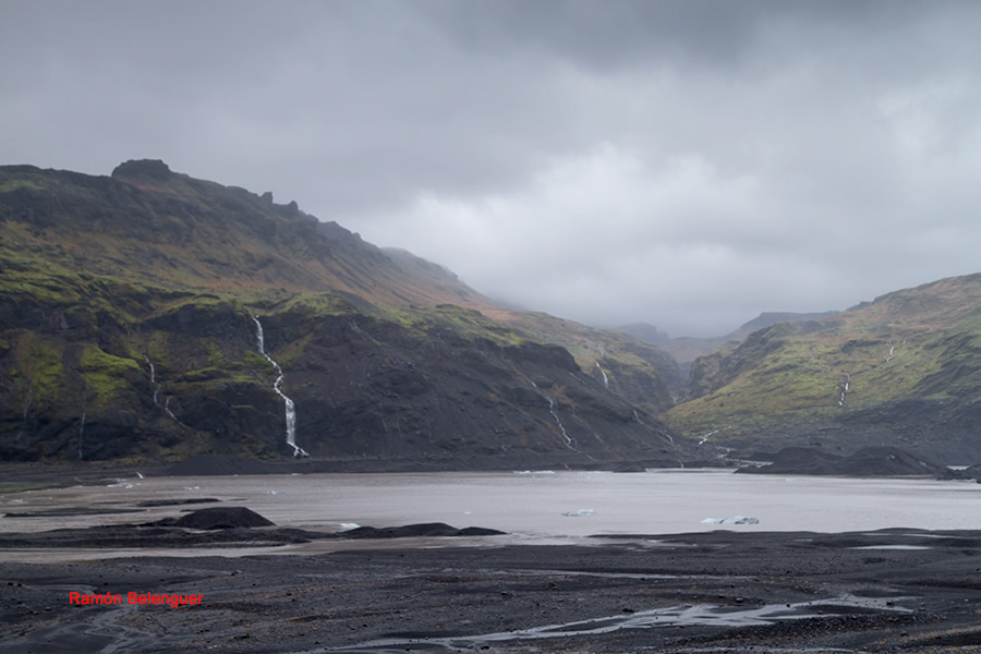La lengua glaciar Sólheimajökull se extiende desde el glaciar Myrdalsjökull hasta las arenosas llanuras de la costa sur de Islandia. El glaciar Myrdalsjökull es el cuarto campo de hielo más grande de la isla, debajo de él se encuentra el Volcán Katla. Éste volcán entro en erupción en 1918 el volcán Katla, las cenizas al caer impregnaron del característico color negro al hielo.