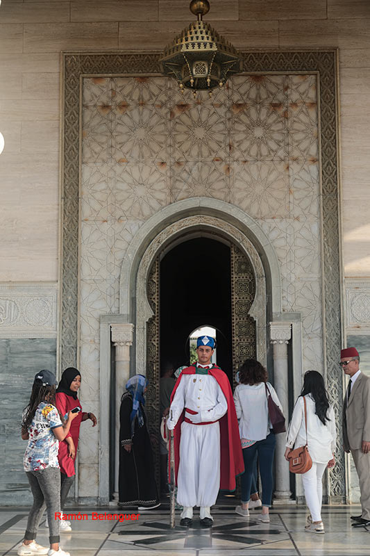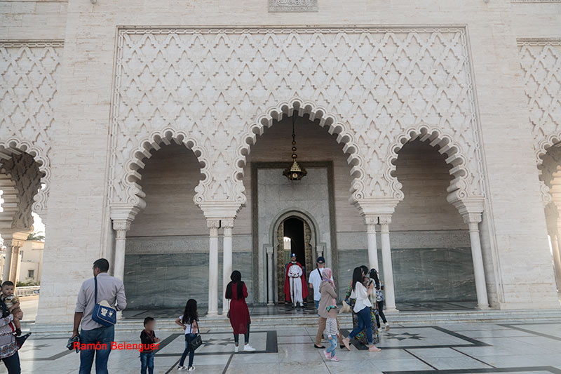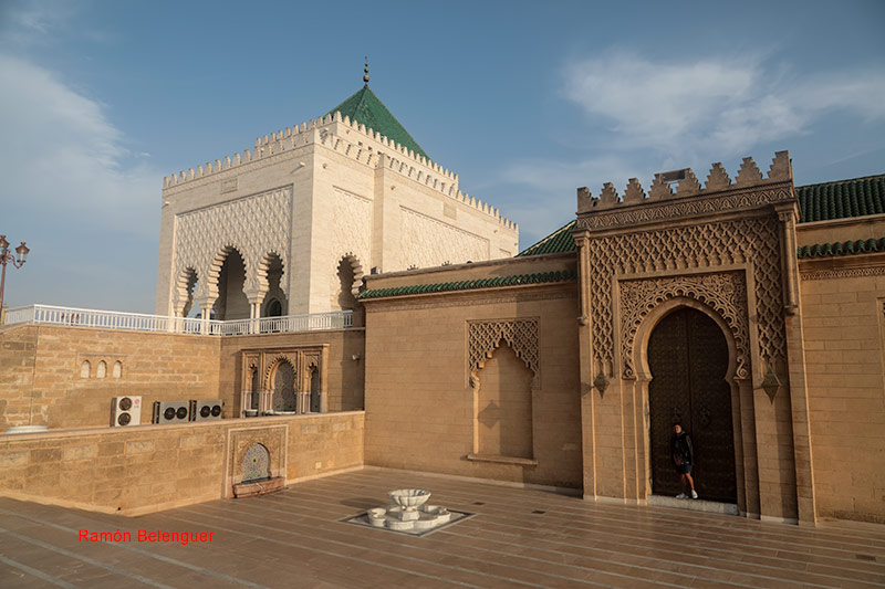 El arquitecto fue el vietnamita Eric Vo Toan, que empleó para las obras de construcción a 400 artesanos marroquíes. El mausoleo, construido entre 1961 y 1971, incluye una mezquita y un museo dedicado a la historia de la dinastía de los Alauitas. El diseño del Mausoleo de Mohamed V está caracterizado por su estilo clásico árabe andaluz. Tiene una fachada de mármol blanco italiano y una superficie de unos 1500 m². A través de un portal, forjado en hierro, se accede a las escaleras que llevan a la cúpula, cuyas vidrieras provienen de los talleres de la compañía de Saint-Gobain en París. La cúpula dodecagonal, sobre la cámara de la tumba, cuenta con muqarnas (elementos arquitectónicos decorativos a base de prismas yuxtapuestos) hechos de caoba y de cedro del Atlas. Está rematada por un tejado de forma piramidal de color verde, símbolo de la dinastía aluí. Los portales de los cuatro lados del Mausoleo de Mohamed V están flanqueados por esbeltas columnas de mármol de Carrara. Las entradas conducen a un balcón, desde donde se puede ver en el centro el sepulcro de Mohamed V y en las esquinas los sarcófagos de sus hijos, el primogénito Hassan II y su hermano el Mulay Abdellah. Del sarcófago de Mohamed V, se ve la parte superior, está tallado en una sola pieza de ónix blanco pakistaní y descansa sobre un bloque de granito azul, frente a la quibla (muro orientado hacia La Meca). En el exterior del Mausoleo de Mohamed V y a pocos metros, se encuentra la Mezquita, fue mandada construir por Hassan II para que el pueblo marroquí pudiera ir a rezar junto al Mausoleo de Mohamed V y recuperar el espíritu religioso que tuvo antiguamente. Su exterior es sobrio, en el que destacan la belleza de sus puertas con arcos de herradura apuntados