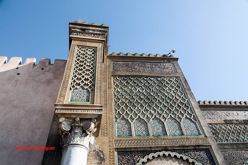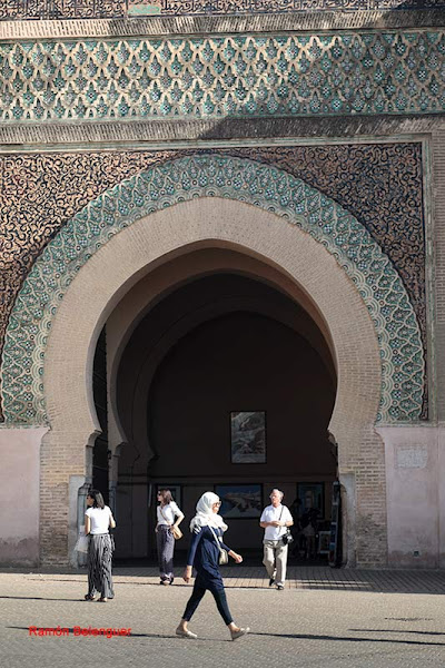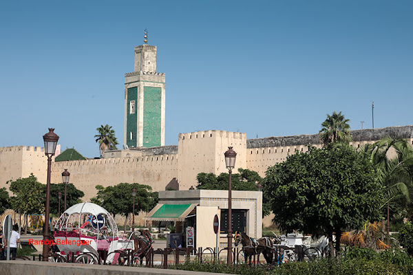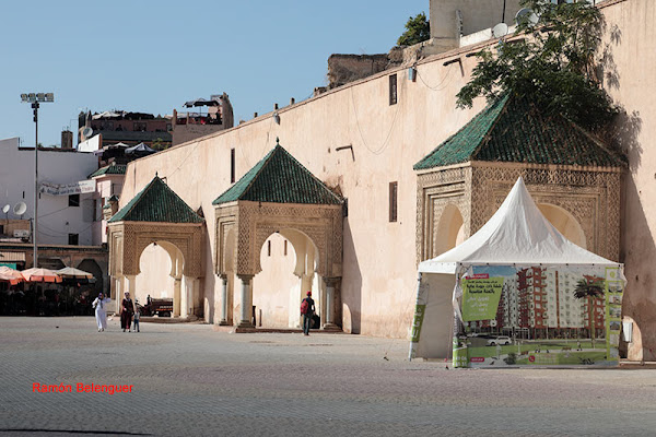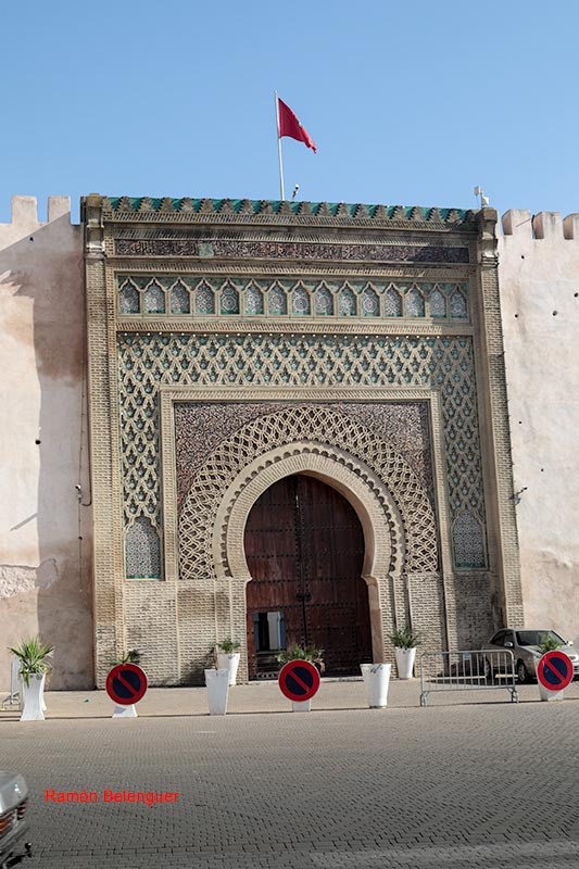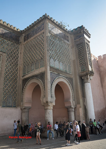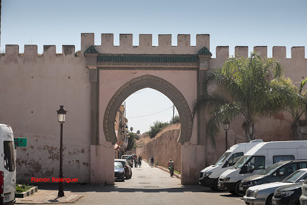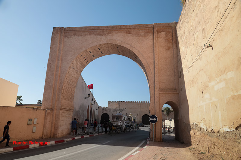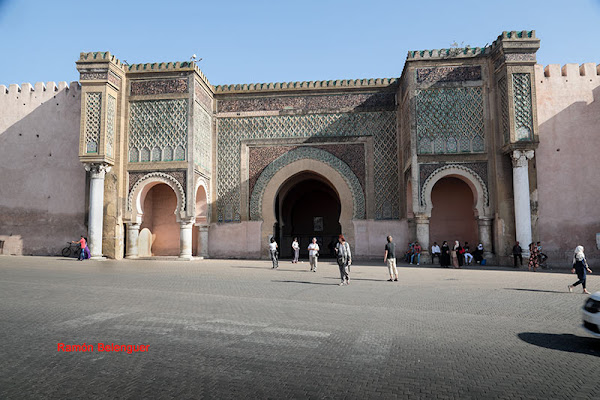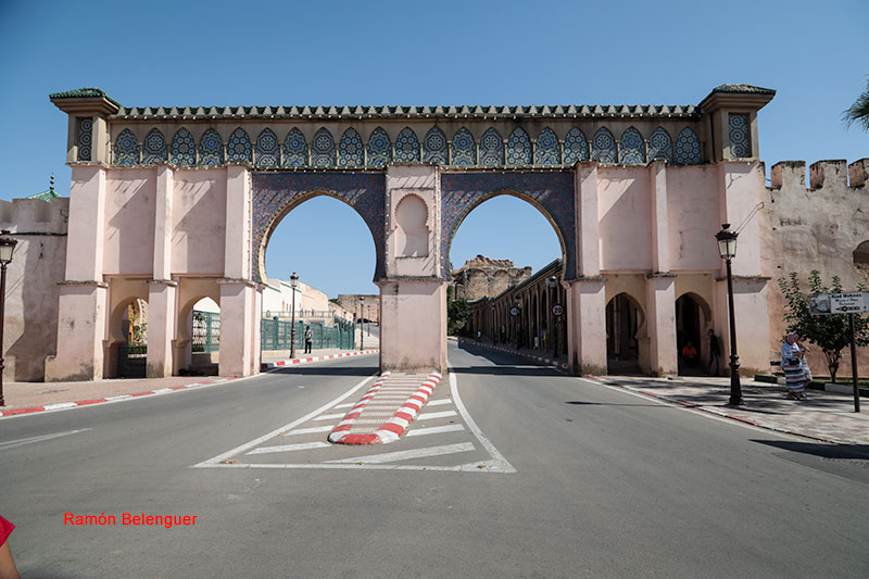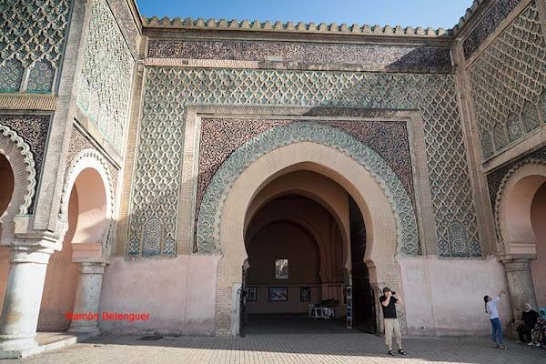Puerta Bab El-Mansour: llamada en honor a su arquitecto, un cristiano converso que la decoró por completo con diminutos fragmentos de cerámica vidriada verde y blanca, que brilla con la luz del sol. Está considerada como una de las puertas más bellas del mundo. Es la puerta más grande de Marruecos e incluso de todo el norte de África. Fue un encargo del famoso Sultán Moulay Ismail, siendo completada en 1732 por Mulay Abdallah, hijo del sultán Mulay Ismail tras 60 años de construcción. Mide 16 metros de alto y se encuentra en uno de los extremos de la plaza El Hedim. Esta puerta servía para unir la plaza El Hedim y, por extensión, la medina de Meknes con la plaza Lalla Auda en la fortaleza Dar el Kbir. Representa el poder de esta ciudad imperial. Bab el Mansour fue renovada integralmente en los años noventa, los trabajos de restauración sirvieron para realzar el color verde oscuro, que es el característico de la ciudad imperial de Mequinez. Esconde una leyenda más que curiosa, aunque es probable que sea falsa. Cuando el sultán preguntó al arquitecto si la podría haber hecho mejor, él le respondió que sí. Entonces el sultán le ejecutó. Sin embargo, la puerta se acabó en 1732, mientras que Ismaíl falleció en 1727. Cierta o no, no está de más conocer su historia.