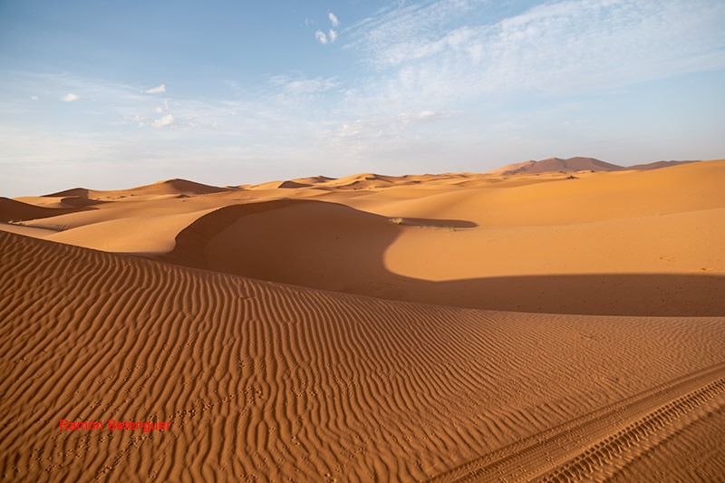 El Erg Chebbi es el más accesible y por tanto el más conocido de los pequeños ergs. Ocupa una parte de la cubeta topográfica situada entre el macizo de Taouz y la hamada (desierto rocoso). Tiene unos 20 Km de largo y 4-5 Km de ancho, y algunas de sus dunas piramidales sobrepasan el centenar de metros de altura. La arena de sus dunas posee la típica coloración anaranjada de las arenas saharianas y está compuesta casi exclusivamente por granos de cuarzo de tamaño muy similar. Las dunas pueden alcanzar los 150 metros de altura. Cuenta la leyenda que estas impresionantes dunas son el resultado de un castigo divino infligido a los habitantes del antiguo pueblo de Merzouga, los cuales mientras celebraban una fiesta rehusaron a acoger a una mujer y a sus hijos que llegaron extenuados y murieron al no recibir auxilio. Una furiosa tormenta de arena se levantó cubriendo por completo al pueblo y sus habitantes. Desde entonces dicen que se escuchan gritos a mediodía saliendo de las inmensas dunas