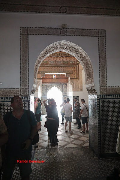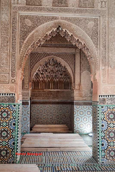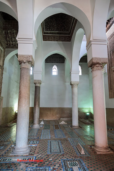 A través de un estrecho se entra en una zona ajardinada y completamente rodeada por unas altas murallas. A la izquierda se encuentra la Sala de las Doce Columnas, a una muy estrecha puerta, en la que apenas caben dos personas; desde aquí vas a poder apreciar la enorme belleza de la decoración de la citada Sala de las Doce Columnas. Esta sala de forma cuadra, con diez metros por cada lado, consta de doce columnas de mármol de Carrara, el techo decorado de madera de cedro con relieves de oro, en el suelo se ven varias tumbas saadies. En frente el Mausoleo de Lalla Messaouda, con el suelo cubierto por piedras alargadas, que son las primeras tumbas saadies que vas a ver. También podemos ver un bello jardín donde se encuentran más de 100 tumbas decoradas por unos coloridos mosaicos.