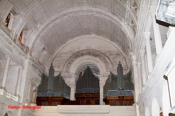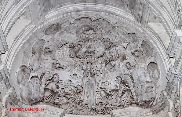 El ábside la capilla mayor se encuentra presidido por un relieve en piedra que representa a la Santísima Trinidad coronando a María, de Maximiano Alves.