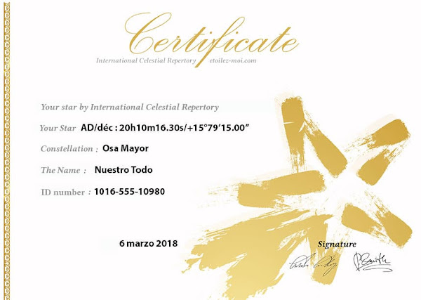 Gracias a ETOILEZ MOI por la oportunidad de hacer un regalo especial a mi persona favorita en el mundo y darme la oportunidad de que haya sido un regalo perfecto en una fecha muy especial para ambos. Quieres demostrar tu amor, celebrar un nacimiento o cumpleaños, quieres pedir matrimonio... cualquier cosa que se te ocurra puedes hacerlo a un más especial, regalando una ESTRELLA.