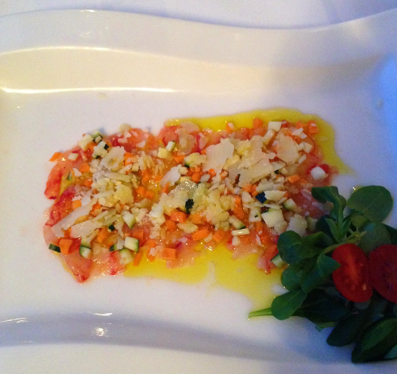 A mí este plato me encantó. Probablemente el mejor de todos los que comimos: gambas crudas con aceite, verduritas (calabacín, zanahoria, cortadas en dados muy pequeños), parmesano y una vinagreta...se me hace la boca agua de recordarlo. ;)