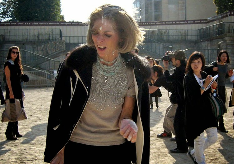 La primera fue cuando recibió un tartazo de miembros de la asociación pro defensa de los derechos de los animales PETA por su afición a lucir pieles, mientras se dirigía a ver el desfile de Chloè ( París Fashion Week, octubre 2005 ),