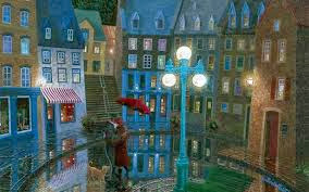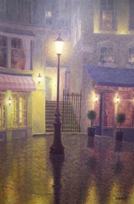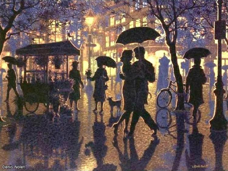el pavimento mojado refleja la arquitectura, figuras, farolas, árboles, floreros,