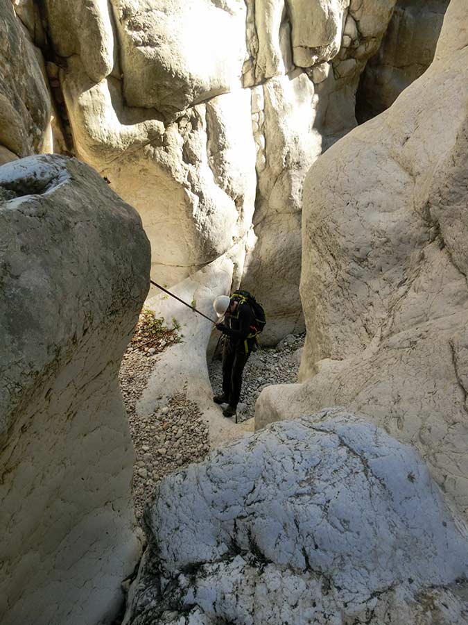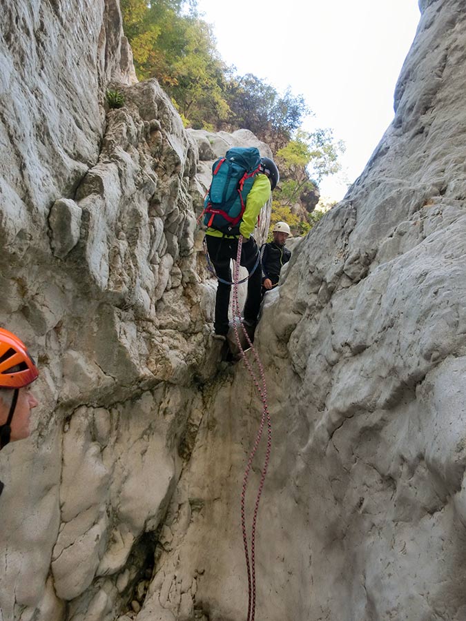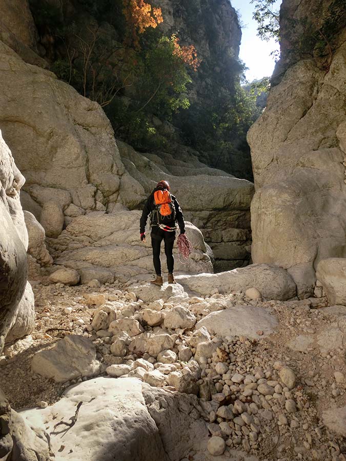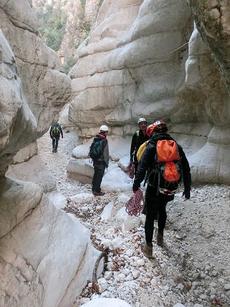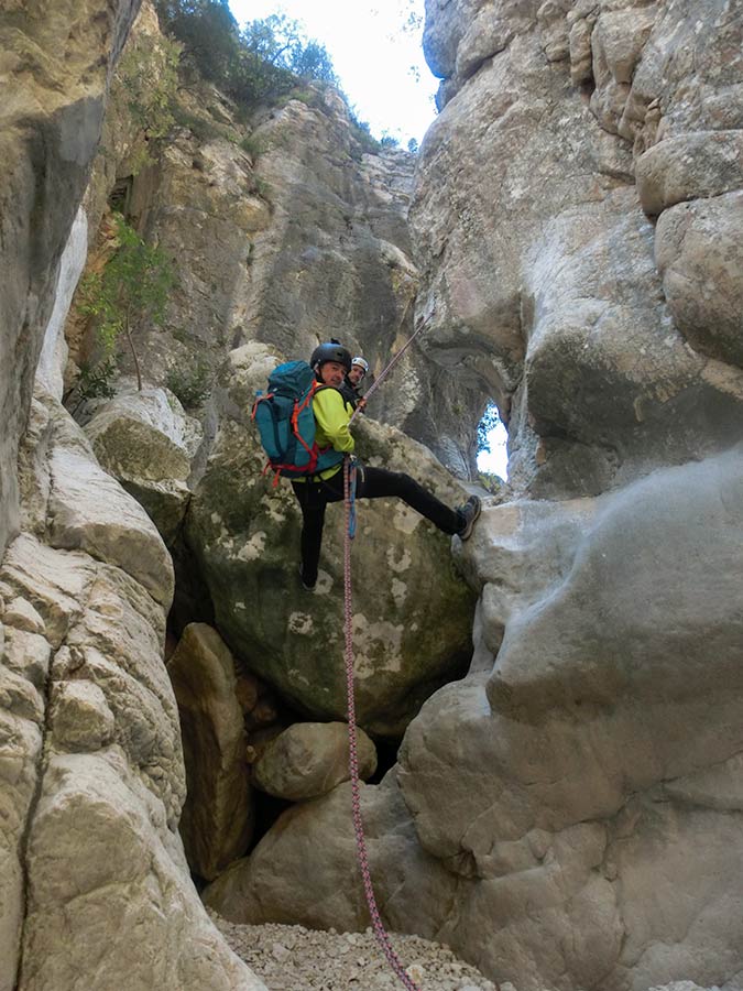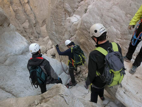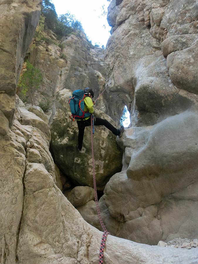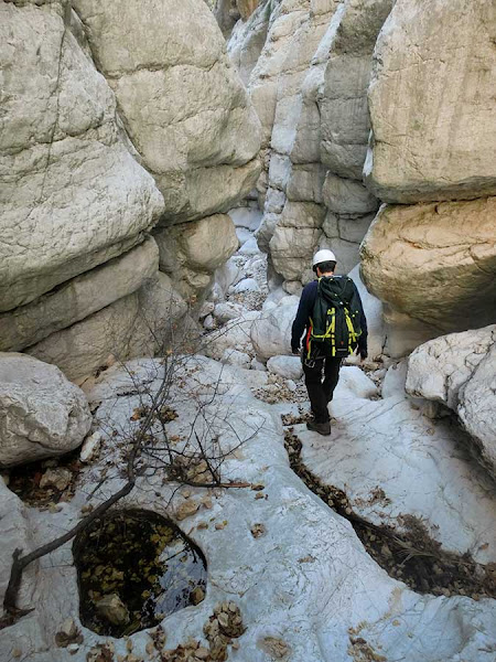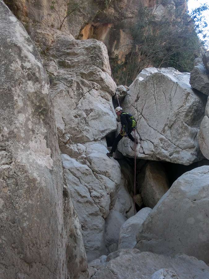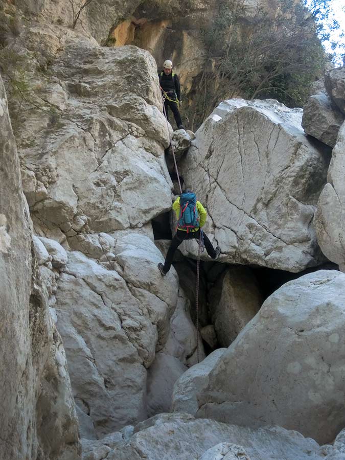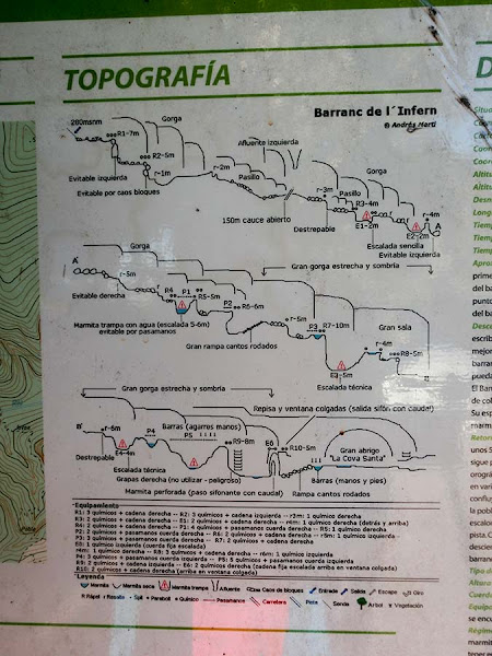 En condiciones normales el barranco se encuentra seco debido a su régimen torrencial, pero en época de lluvias hay grandes crecidas muy peligrosas, que han ocasionado más de un fallecimiento, por ello antes del descenso del primer rapel y debajo de una adelfa o baladre, existe una marca, un circulo verde que marca el nivel de agua, si se encuentra tapado, lo mejor es no entrar. El descenso del barranco tiene 10 pasos equipados entre rápeles y pasamanos. El rapel más largo tiene unos diez metros. Existen tres marmitas residuales permanentes, que se evitan cómodamente gracias a los pasamanos instalados. El tramo de garganta comprendido entre el rápel de 8m (R7) y el final del barranco es extremadamente profundo y encajado, por lo que no existe ningún posible escape. Al final del barranco hay una gran marmita de recepción del último rápel (marmita perforada), que cuando el barranco lleva agua puede quedar sifonada y sólo es posible salir de ella realizando una escalada por la orilla derecha orográfica, que permite alcanzar una cornisa desde la cual se desciende a la zona situada inmediatamente detrás del sifón. Una cadena instalada en fijo permite superar este punto, aunque con un caudal muy fuerte puede ser complicado debido a las corrientes que se generan.