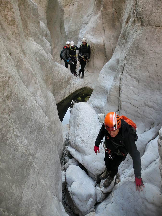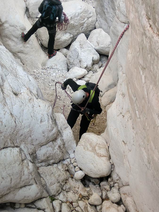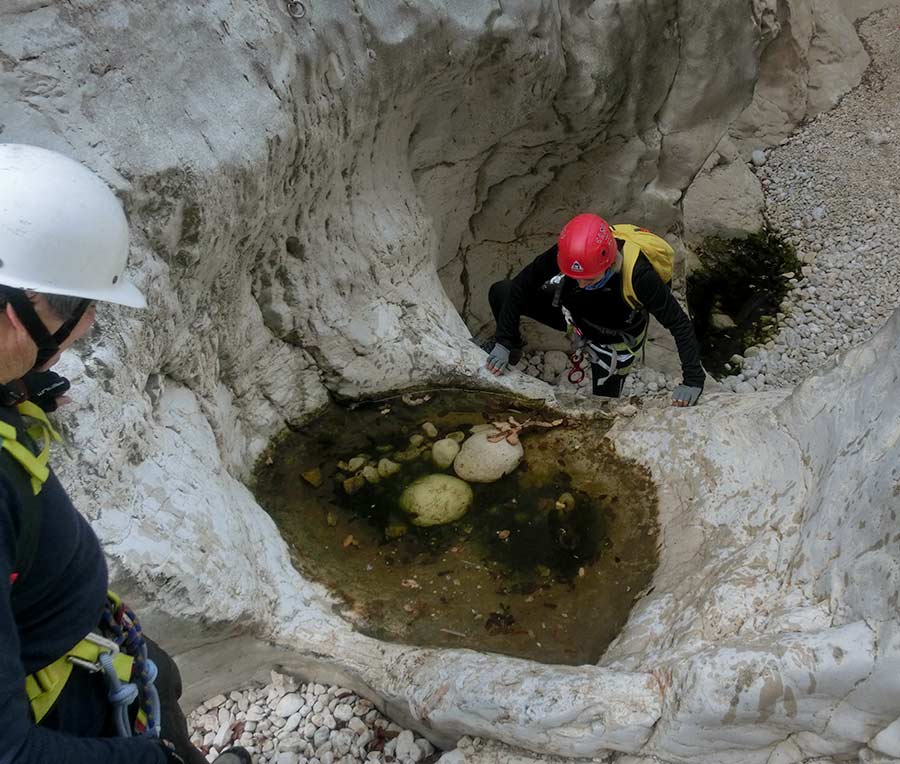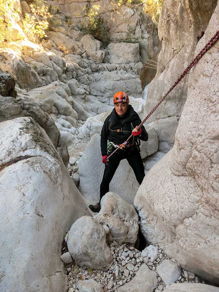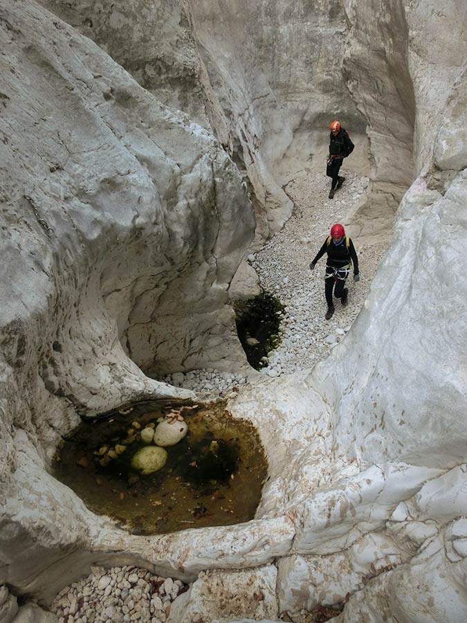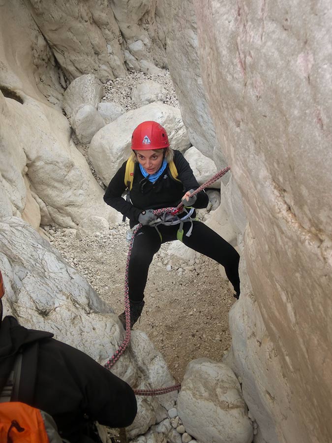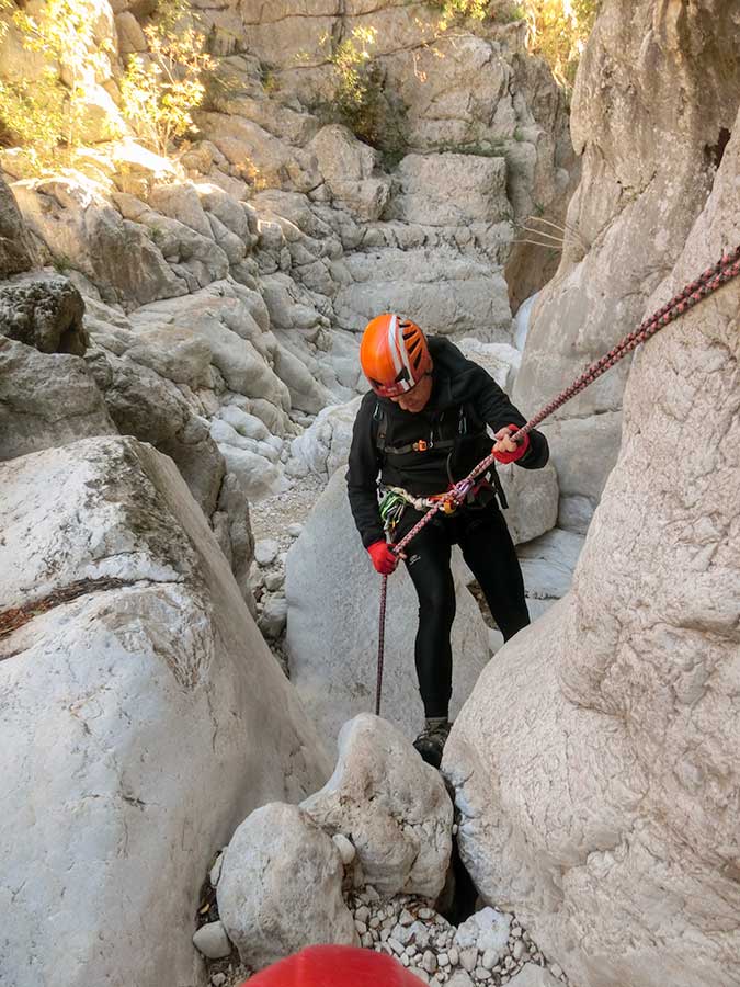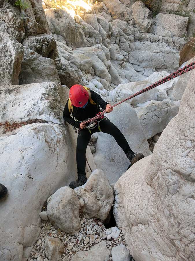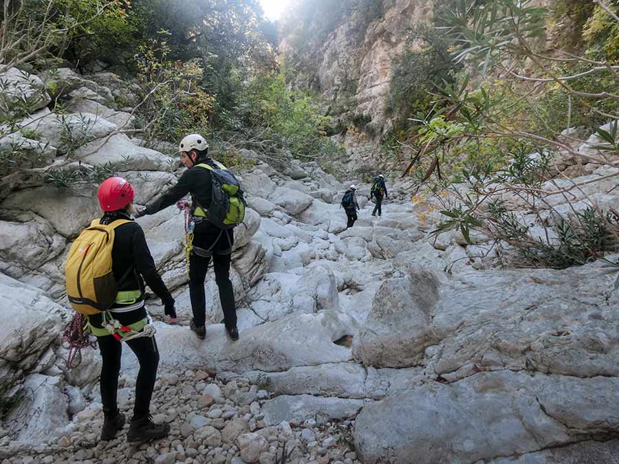 En condiciones normales el barranco se encuentra seco debido a su régimen torrencial, pero en época de lluvias hay grandes crecidas muy peligrosas, que han ocasionado más de un fallecimiento, por ello antes del descenso del primer rapel y debajo de una adelfa o baladre, existe una marca, un circulo verde que marca el nivel de agua, si se encuentra tapado, lo mejor es no entrar. El descenso del barranco tiene 10 pasos equipados entre rápeles y pasamanos. El rapel más largo tiene unos diez metros. Existen tres marmitas residuales permanentes, que se evitan cómodamente gracias a los pasamanos instalados. El tramo de garganta comprendido entre el rápel de 8m (R7) y el final del barranco es extremadamente profundo y encajado, por lo que no existe ningún posible escape. Al final del barranco hay una gran marmita de recepción del último rápel (marmita perforada), que cuando el barranco lleva agua puede quedar sifonada y sólo es posible salir de ella realizando una escalada por la orilla derecha orográfica, que permite alcanzar una cornisa desde la cual se desciende a la zona situada inmediatamente detrás del sifón. Una cadena instalada en fijo permite superar este punto, aunque con un caudal muy fuerte puede ser complicado debido a las corrientes que se generan.