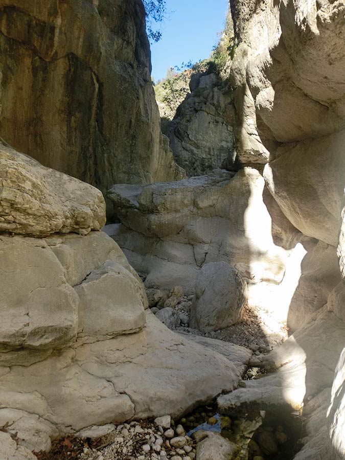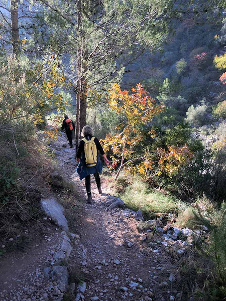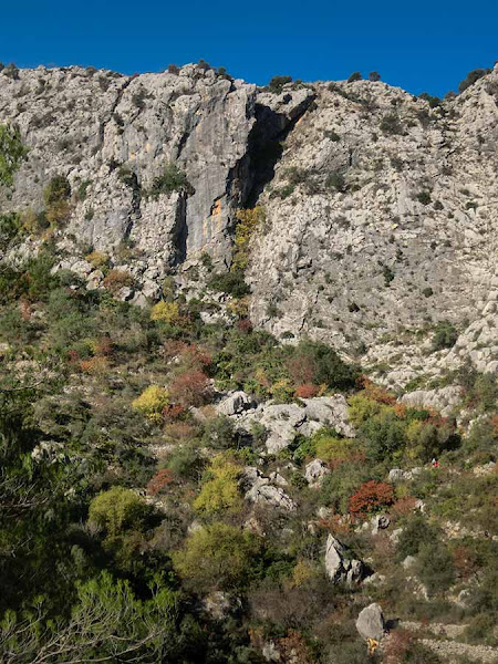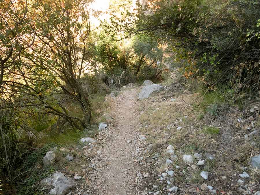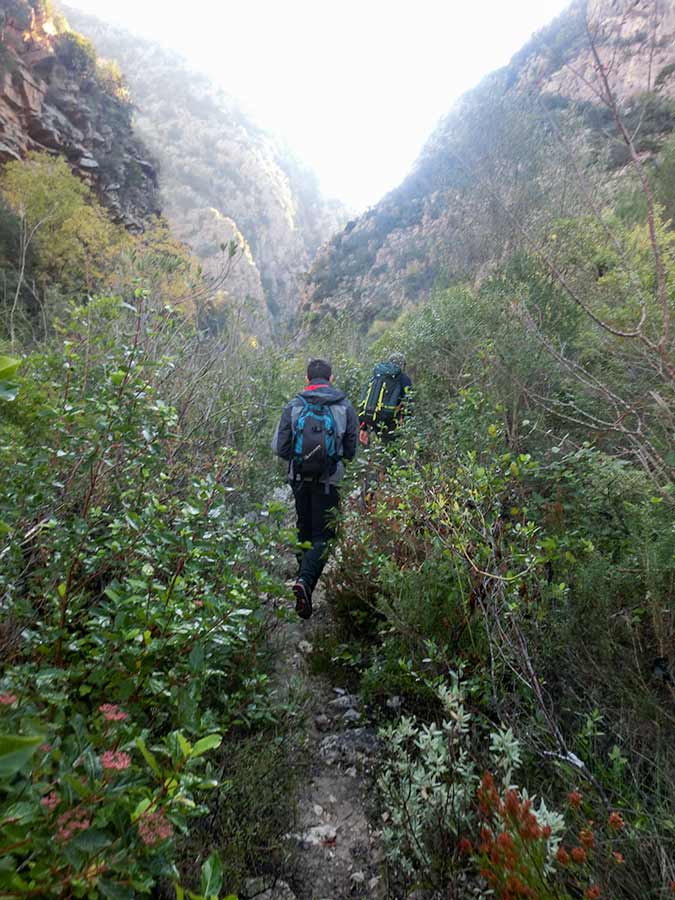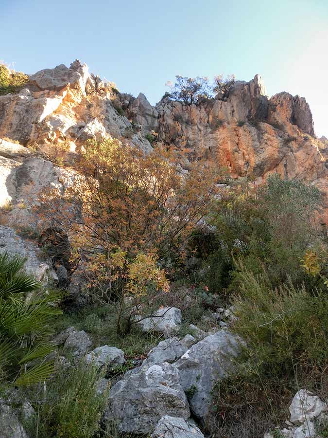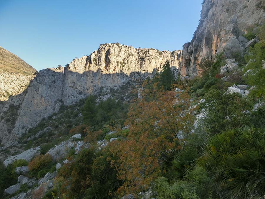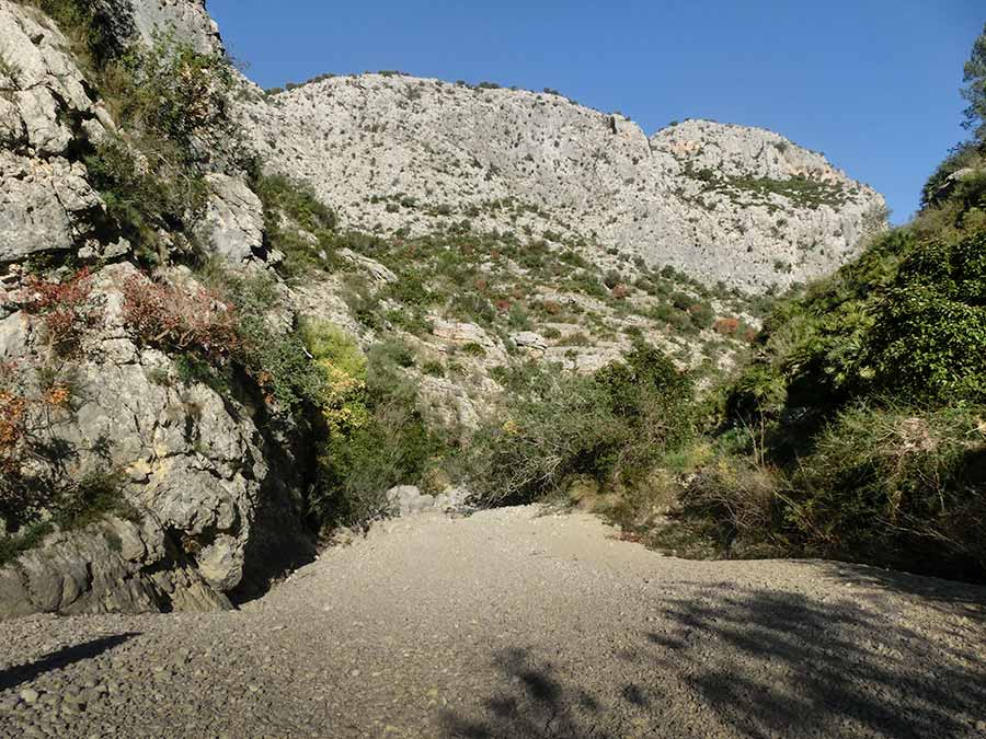 Desde aquí el barranco comienza a abrirse y es posible caminar por varias sendas que discurren paralelas al cauce, hasta dar de nuevo con el cruce del PR-CV 147, por la derecha se sube a Fleix, por la izquierda se regresa al punto de partida y si seguimos el cauce del barranco llegaríamos al embalse de Isbert.