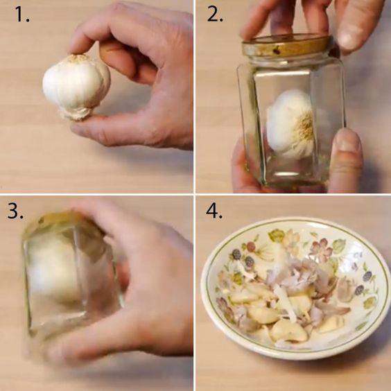 Lo único que necesitas es un frasco de vidrio con su respectiva tapa. Meter dentro del frasco el ajo entero, cerrar perfectamente la tapa, y agitar durante 20 segundos. Después de este tiempo los ajos se habrán desprendido de sus cáscaras, y solo es cuestión de ponerlos sobre un plato, retirar las cáscaras de los dientes de ajo ¡Y listo! Si no tienes un frasco adecuado no te preocupes, puedes hacer el procedimiento ayudándote de un viejo tazón y usando como tapa la tabla de picar.