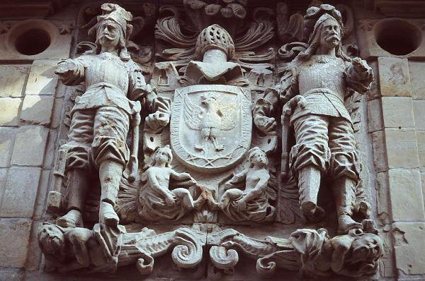 La fachada de piedra da a la calle y el pórtico tiene cuatro arcos que soportan dos entradas. El diseño en la pared tiene un gran escudo de armas con caballeros a cada lado y las palabras “Un Buen Morires Onra de la Vida” grabado, lo que significa “un buen morir honra la vida”.