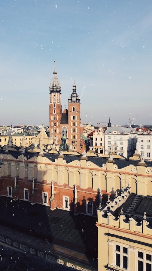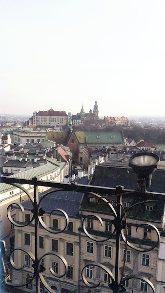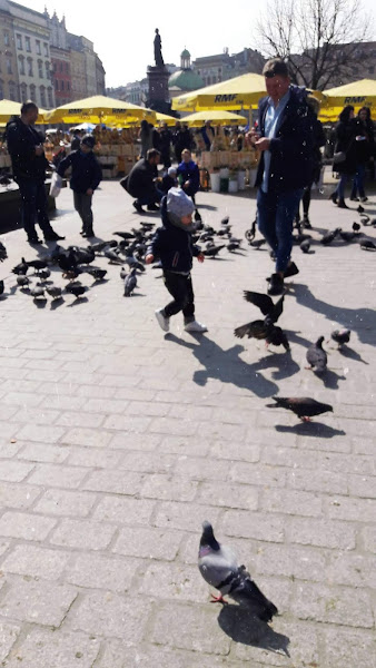 La torre que se ve al fondo, es la torre de la iglesia de Santa María. Desde allí, todas las horas en punto se escucha una melodía tocada con una trompeta. Se toca en las cuatro direcciones y para bruscamente...¿sabéis por qué? Es otra de las leyendas que nos contaron que dice que Desde la Edad Media el día entero, fuera de noche o de día, había en la torre más alta de la iglesia de Santa María un vigilante que advertía de incendios, de enemigos que se acercaban a la ciudad y de otros peligros. Una de las responsabilidades del vigilante era hacer sonar el toque de trompeta: inicialmente, solo al amanecer y al atardecer, para avisar sobre la hora de la apertura o cierre de las puertas de la ciudad y más tarde, desde el siglo XVI —cada hora—. La melodía del toque de trompeta, llamada en polaco "hejnał", se convirtió en un símbolo musical de Cracovia. Se toca a los cuatro vientos, cada hora en punto. Pero… ¿por qué la melodía se corta tan bruscamente? En el año 1241 llegaron a las puertas de Cracovia los tártaros. Según cuenta la leyenda, al ver a los invasores, el vigía de la iglesia de Santa María empezó con el toque de trompeta. De este modo, consiguió avisar a sus ciudadanos del peligro, pero en mitad de una nota una flecha tártara atravesó su garganta y el trompetista murió. Por esta razón, el "hejnał" se corta de forma tan repentina: en el mismo momento en el que dejó de tocarlo el valiente trompetista. (Fuente: Krakow travel). En la actualidad, es un trabajo reservado para jubilados con turnos de 12 horas; allí arriba tienen una cama, baño y wifi, así que ni tan mal, ¿no?
