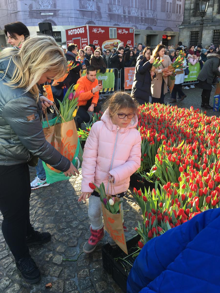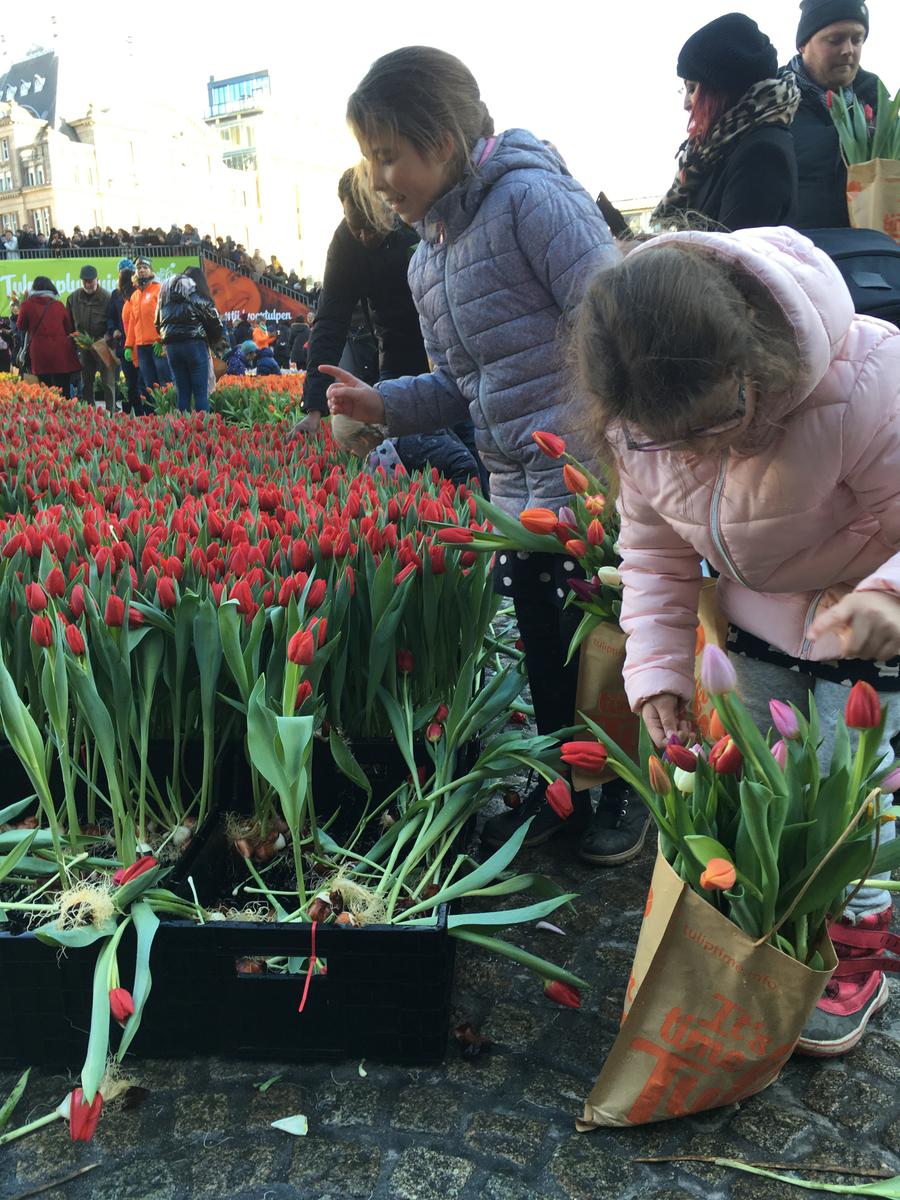 Recogemos tulipanes de todos los colores, las niñas, cual mariposas, van de un lado a otro, las bolsas biodegradables que nos repartieron dadivosamente no son tan fuertes y se deshacen así que mamá las vuelve a hacer.