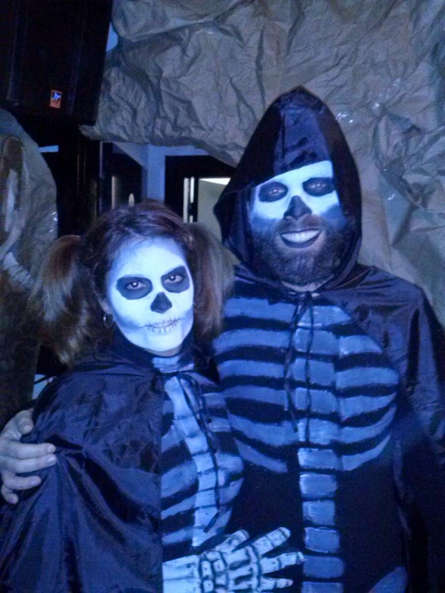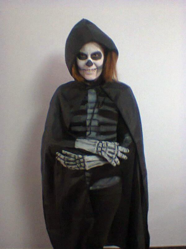 Una vez tenemos la ropa pintada y bien seca, llega el momento del maquillaje de la cara. Hay muchas formas de maquillarse como un esqueleto, pero lo fundamental es pintar con negro los huecos de la calavera: ojos, nariz y boca. Fíjate en las fotos, es más sencillo de lo que parece, y el resultado es muy bueno. Si no estás muy seguro de poder ahcerlo, practica con alguien unos días antes. El lápiz de ojos lo he usado para perfilar de negro algunas zonas, como por ejemplo, los dientes.