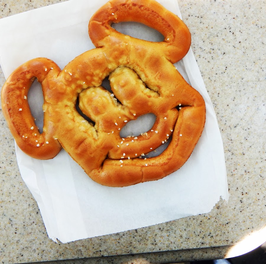 ¡Me comí un pretzel de Mickey!, acompañado de un botecito de queso.