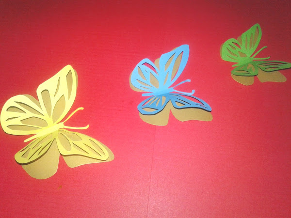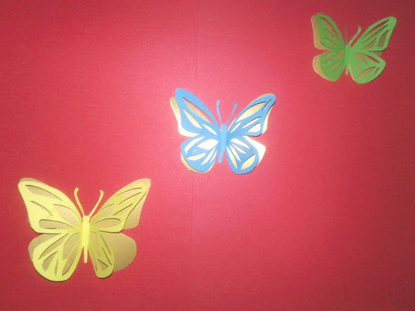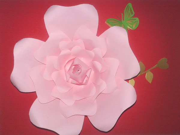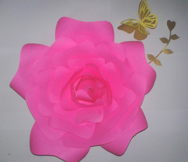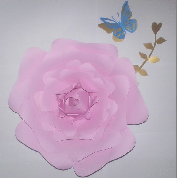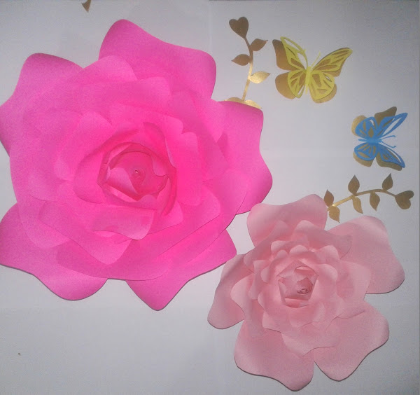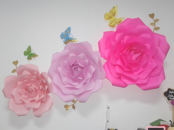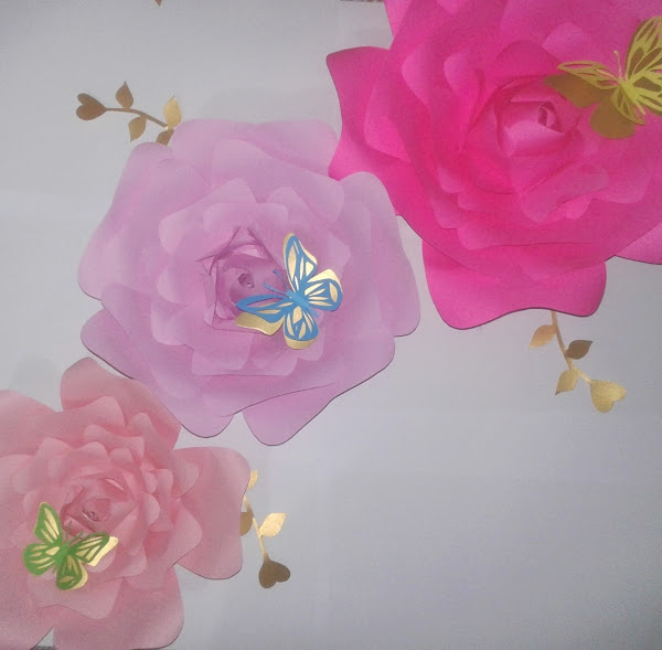 Las rosas fueron elaboradas de hoja arcolor, en los colores fuccia, rosado y palo rosa. Asimismo realicé unas mariposas de papel y cartulina dorada para decorarlas.