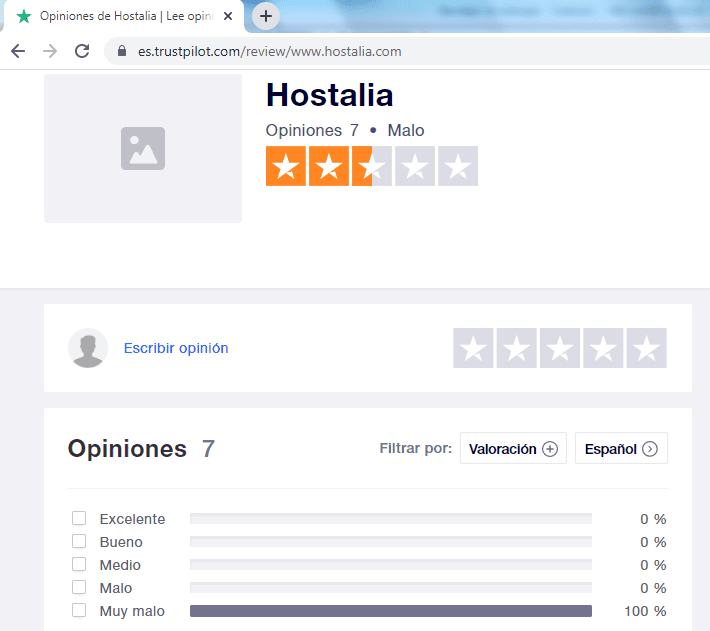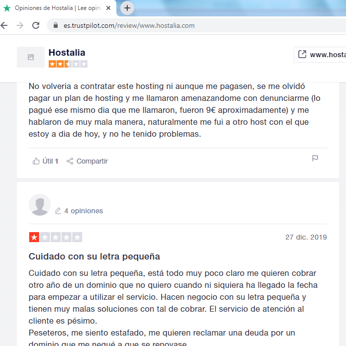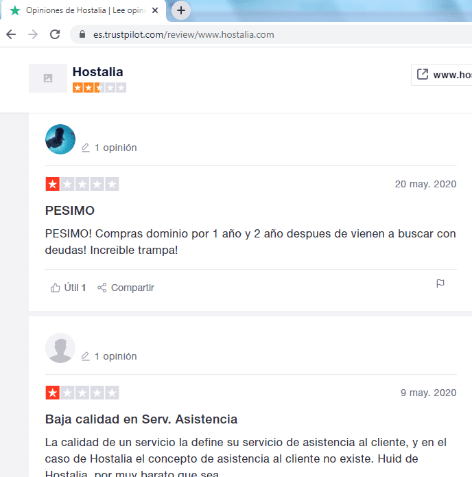Como puedes ver en las impresiones de pantalla, las opiniones de los usuarios no es que sean muy buenas.Por si no te lo crees te dejo el enlace para que puedas comprobar que, efectivamente, estas impresiones de pantalla están sacadas de opiniones reales de Hostalia en la página TrustPilot: