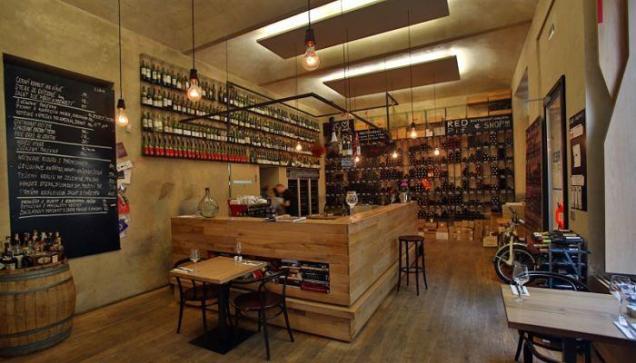 Siendo el mayor proveedor de vino de la República Checa, la empresa tiene un menú siempre cambiante de pequeñas bodegas biodinámicas. La decoración incluye persianas en forma de botella de vino ingenioso para los gabinetes de vino.