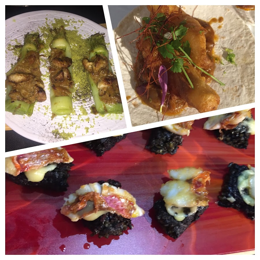 Tacos de camarón con cochinillo, arroz negro socarrat con puré de limón y sashimi de salmonete.... riquísimos.